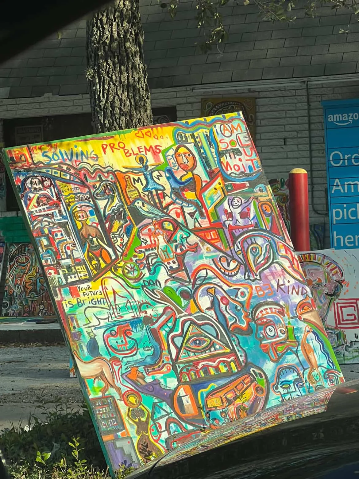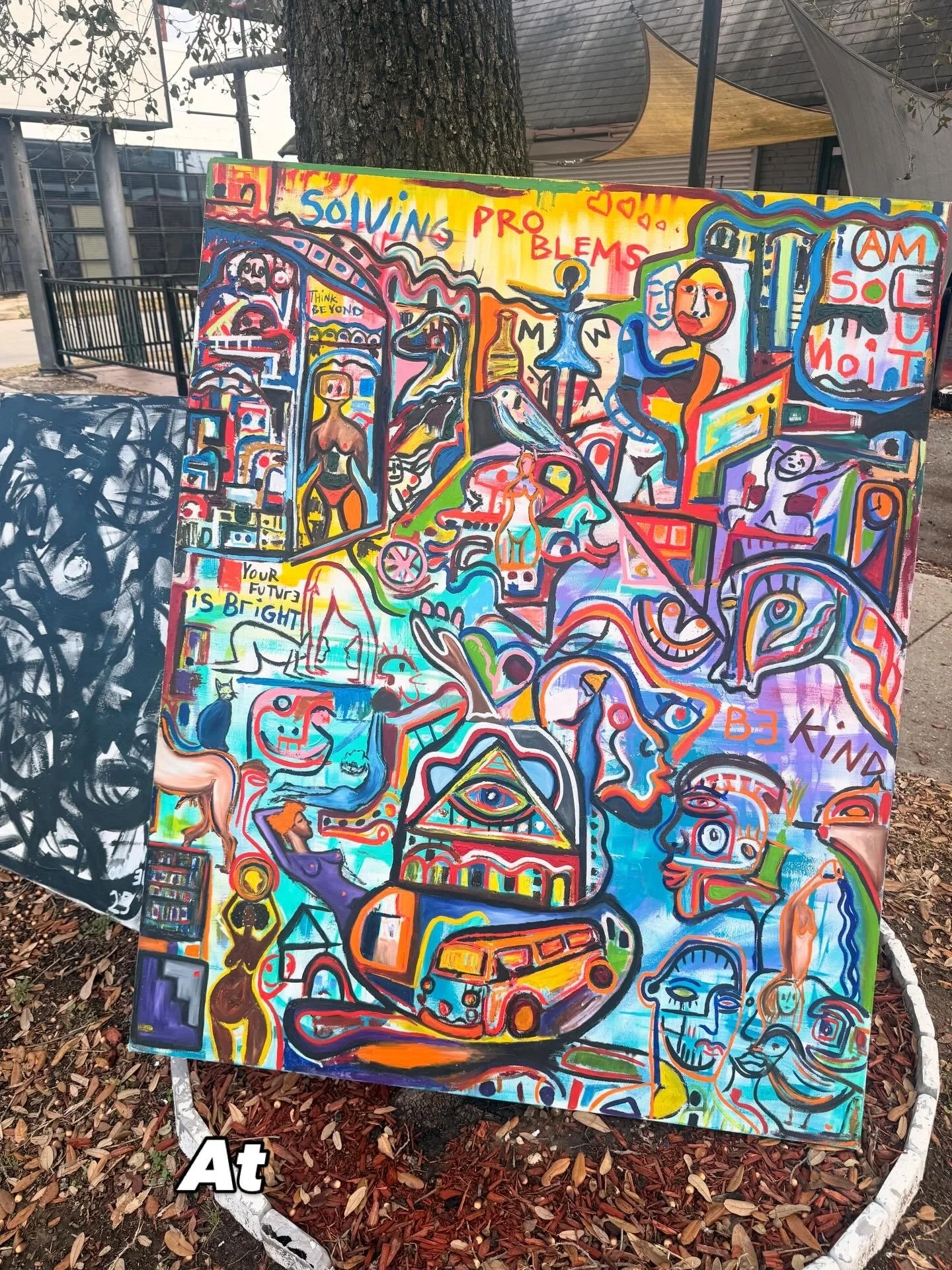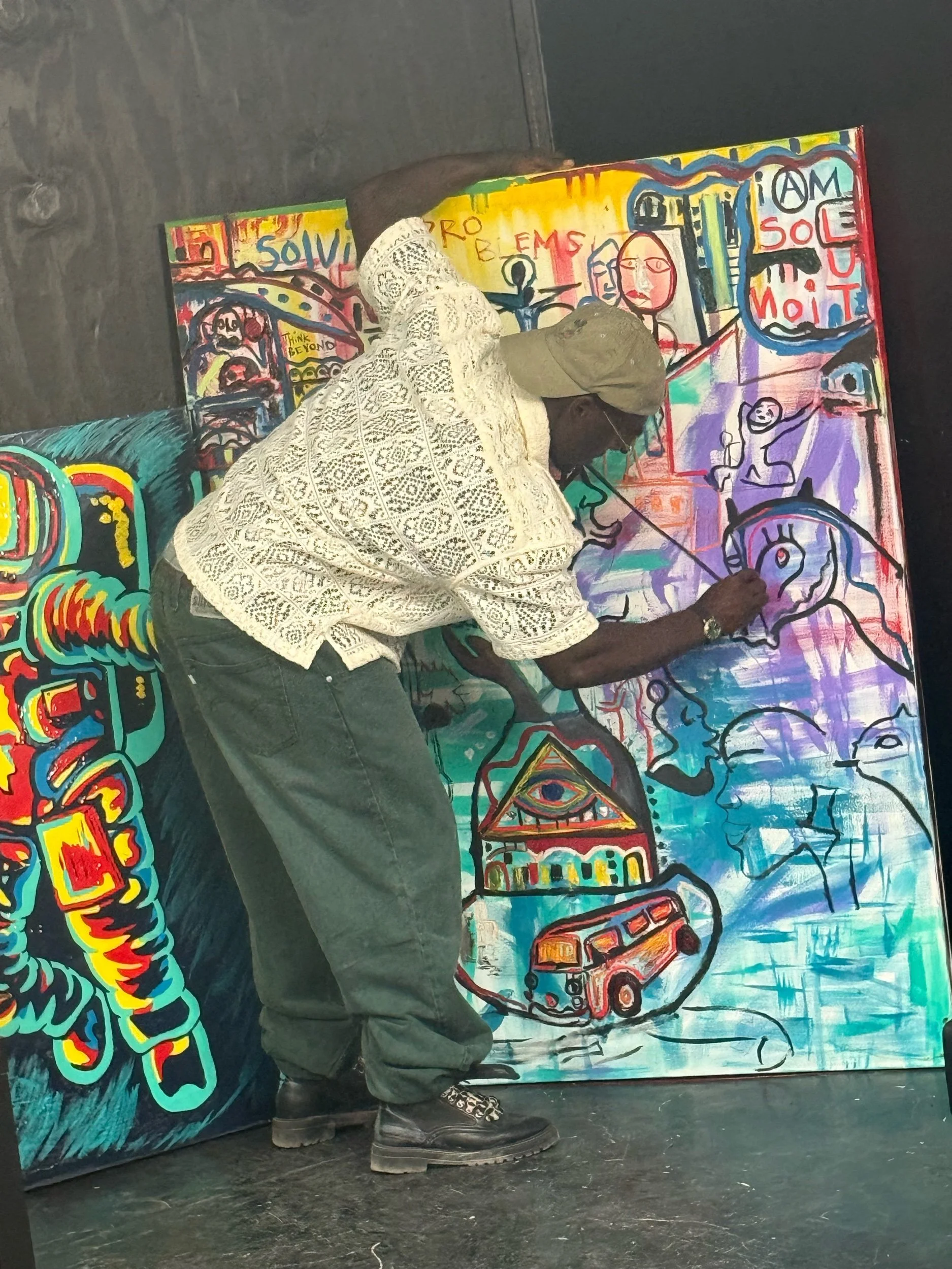 “Solving Problems” is a vibrant visual story about creativity, curiosity, and the human journey of figuring things out. The painting is filled with symbolic characters, abstract faces, and imaginative scenes that represent thought, movement, and growth.