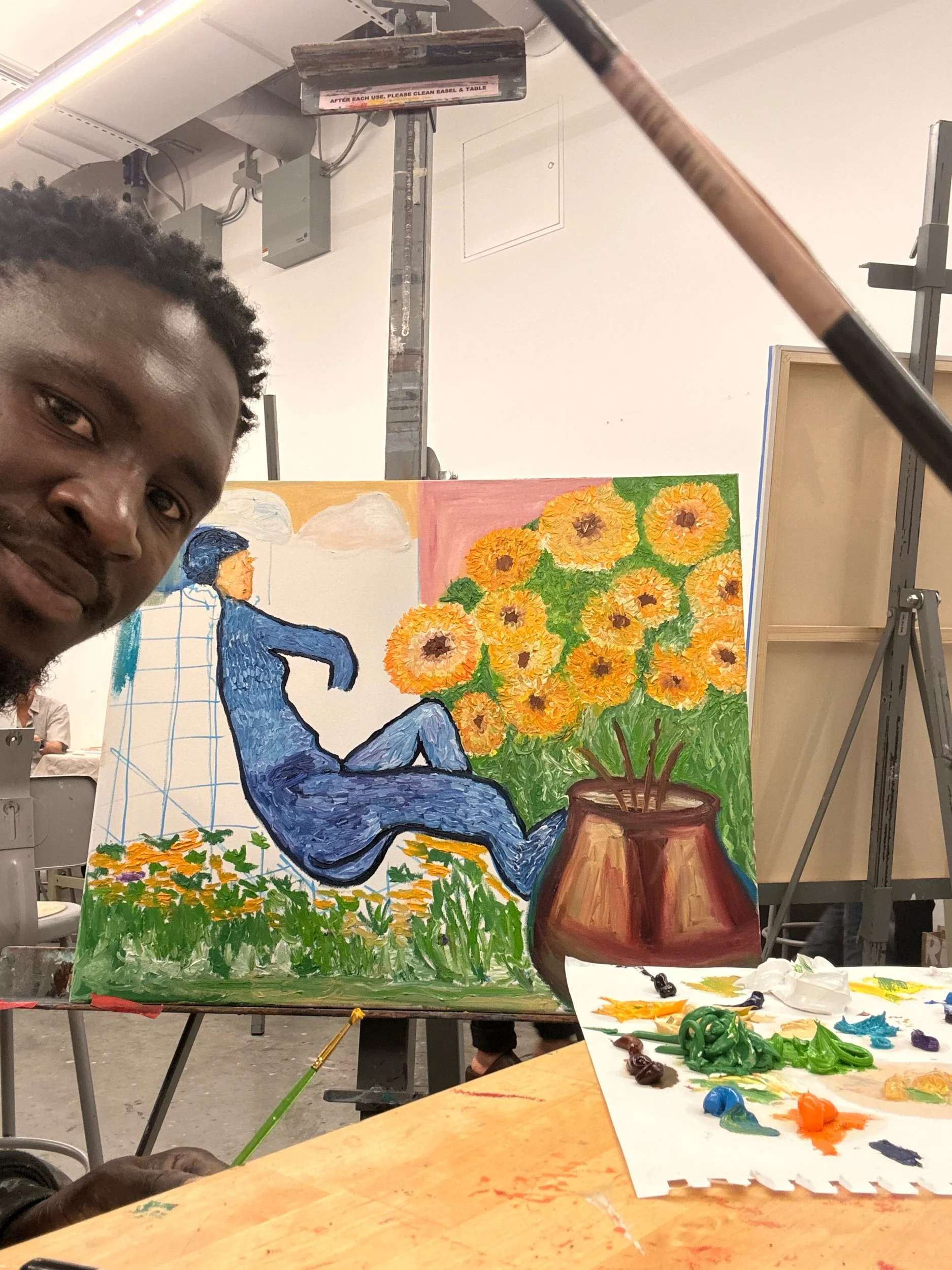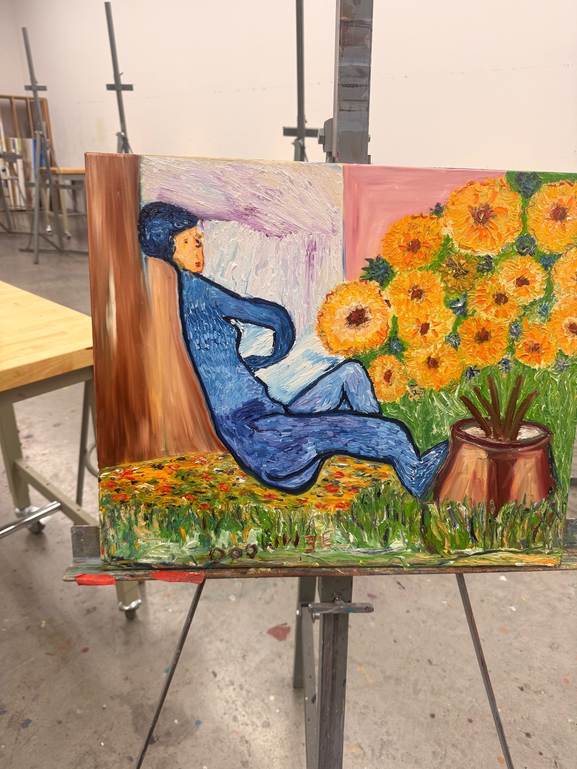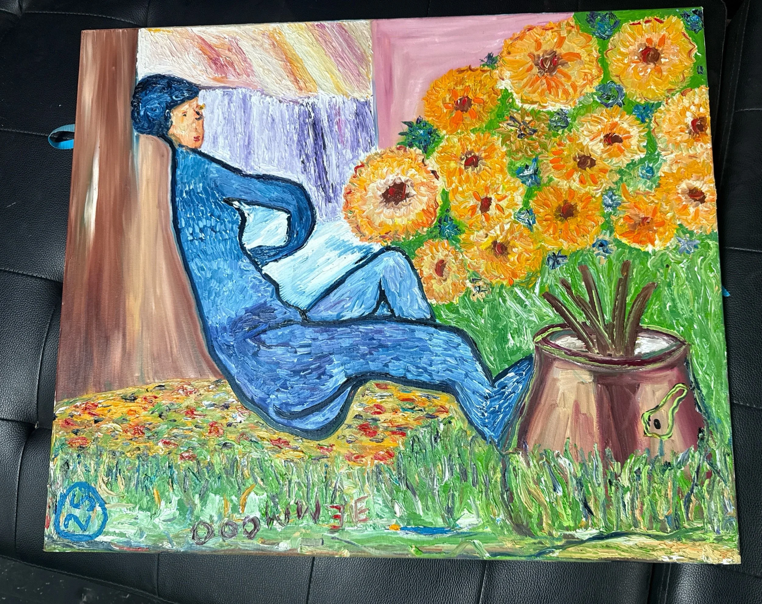 The figure was painted with expressive strokes and cool tones to contrast the warmth of the surrounding flowers, representing the relationship between solitude and renewal.
