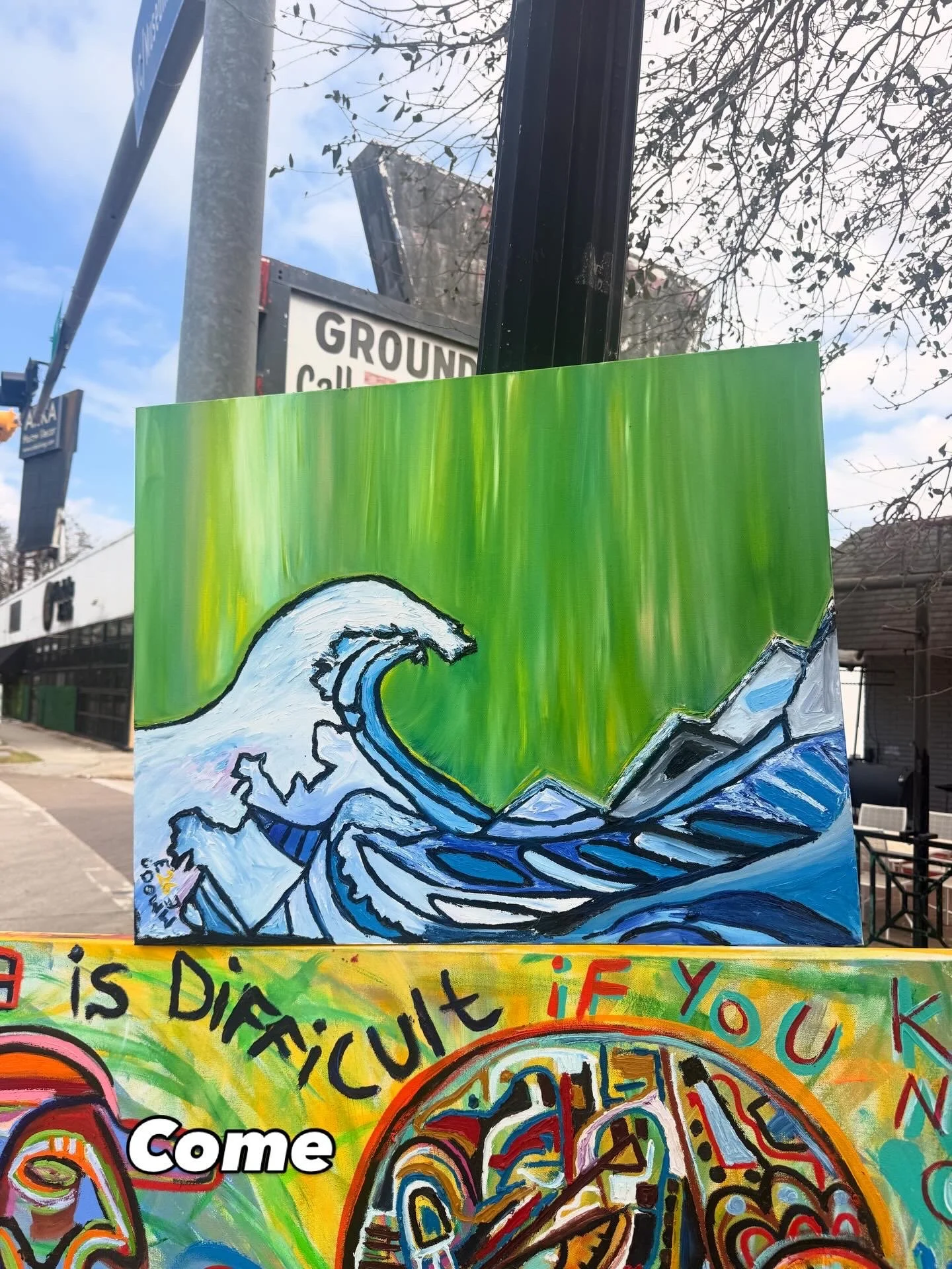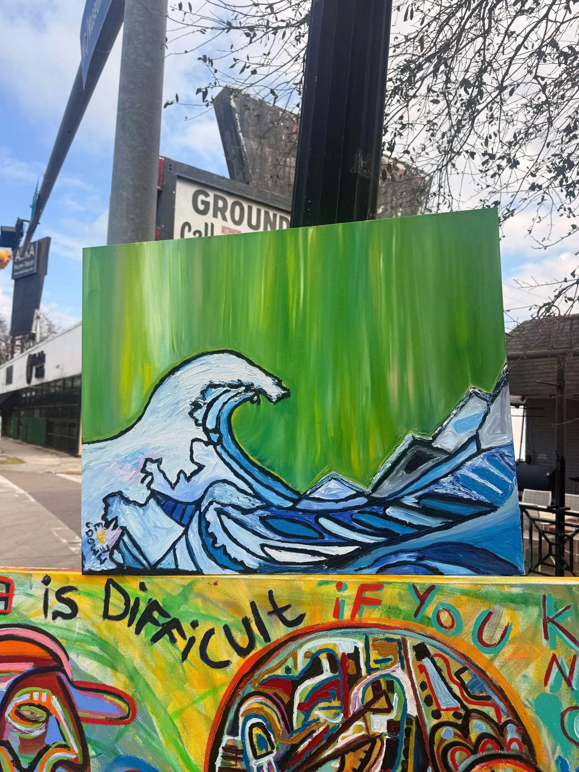 Set against a luminous green sky, the wave feels both calm and powerful at the same time—like the moment right before transformation. The bold outlines and layered brushwork give the piece a dynamic presence, allowing the viewer to almost feel the movement of the water.
