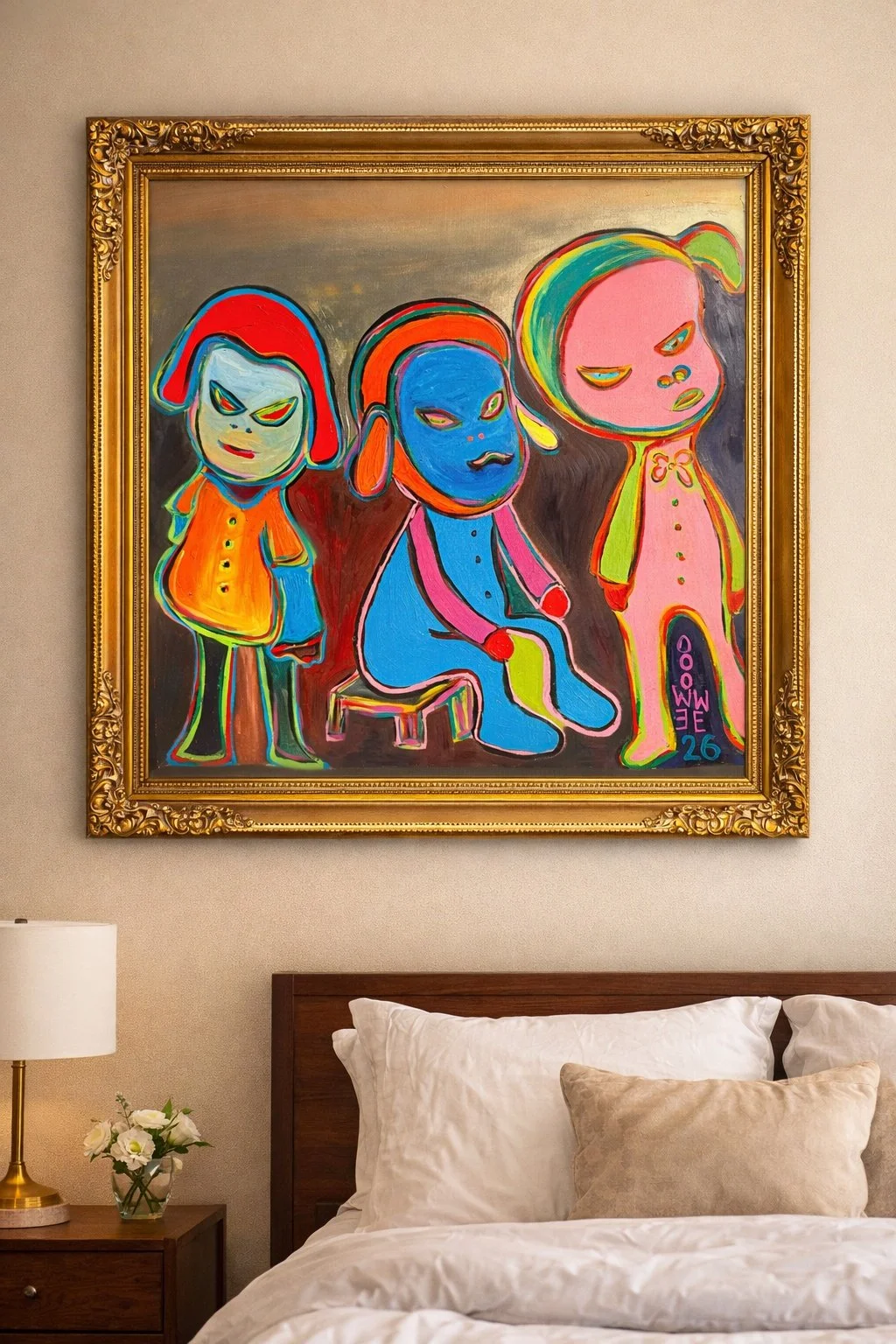 This piece brings color, personality, and storytelling into a room. Its bold characters and expressive colors make it a perfect focal point for creative and social spaces.