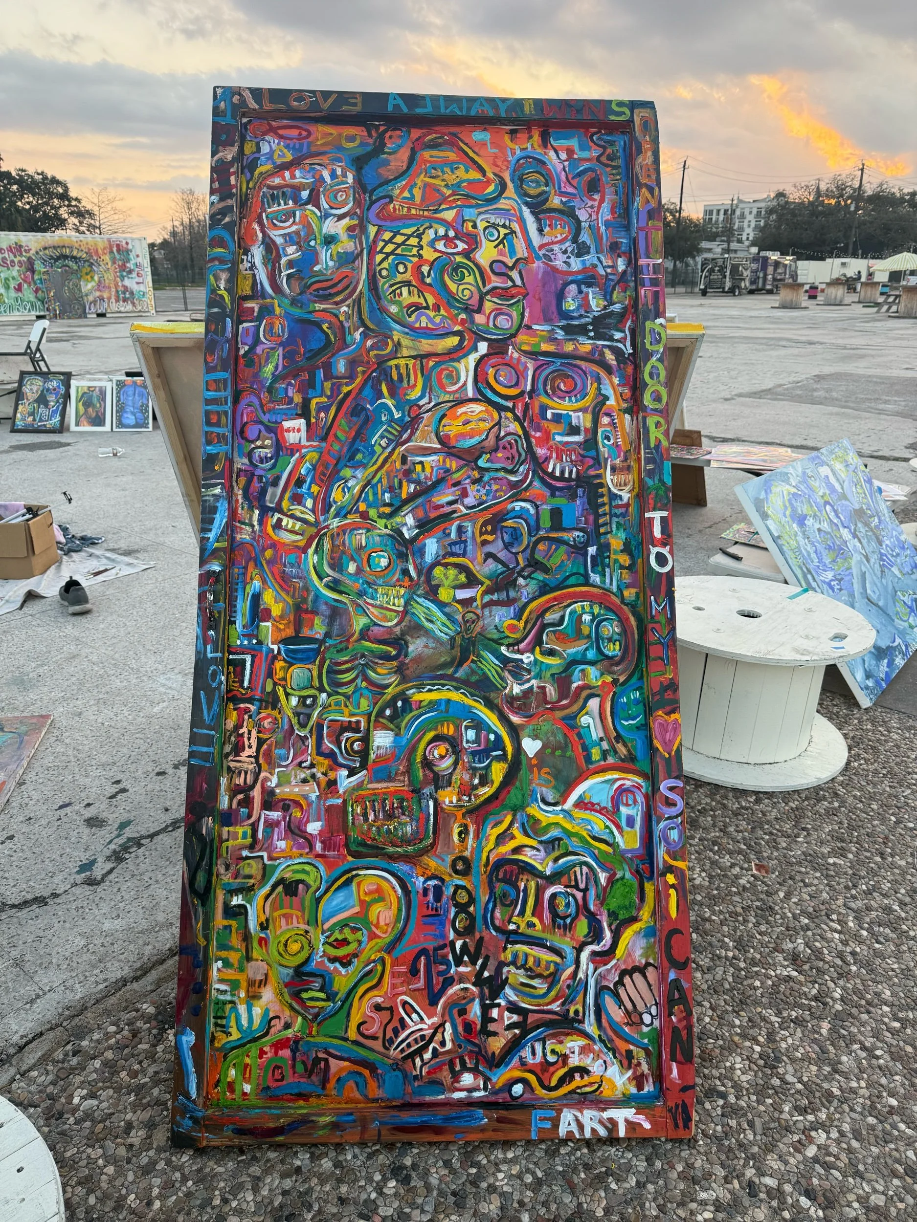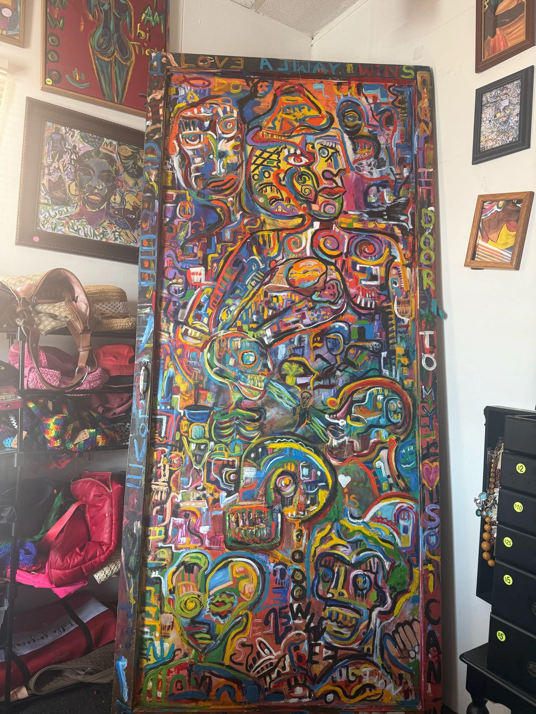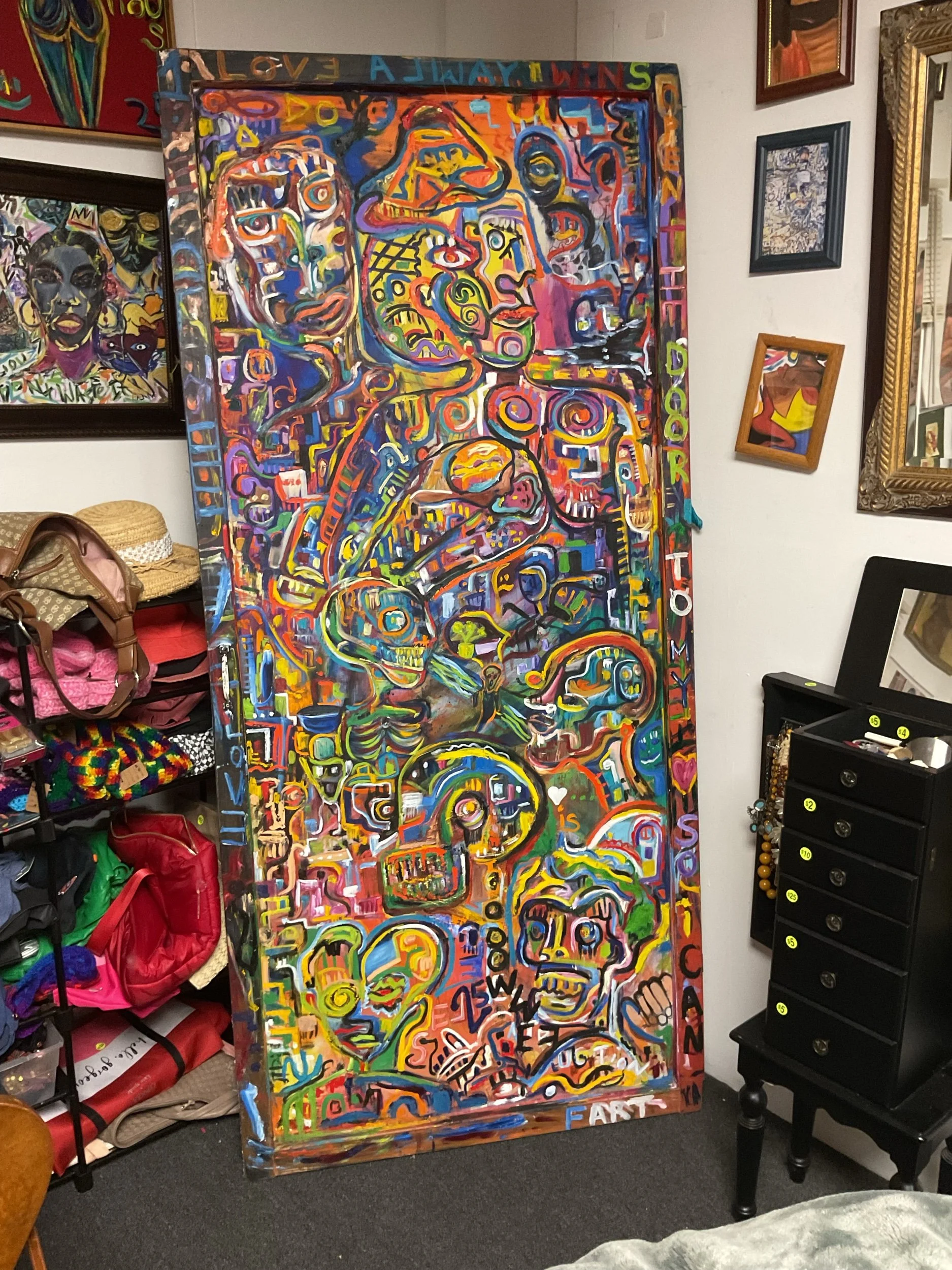 “Door to My Heart” is a deeply expressive piece that explores identity, emotion, memory, and imagination. The painting unfolds like a visual story, filled with layered characters, abstract faces, symbols, and hidden narratives that represent the complexity of human thought and feeling.